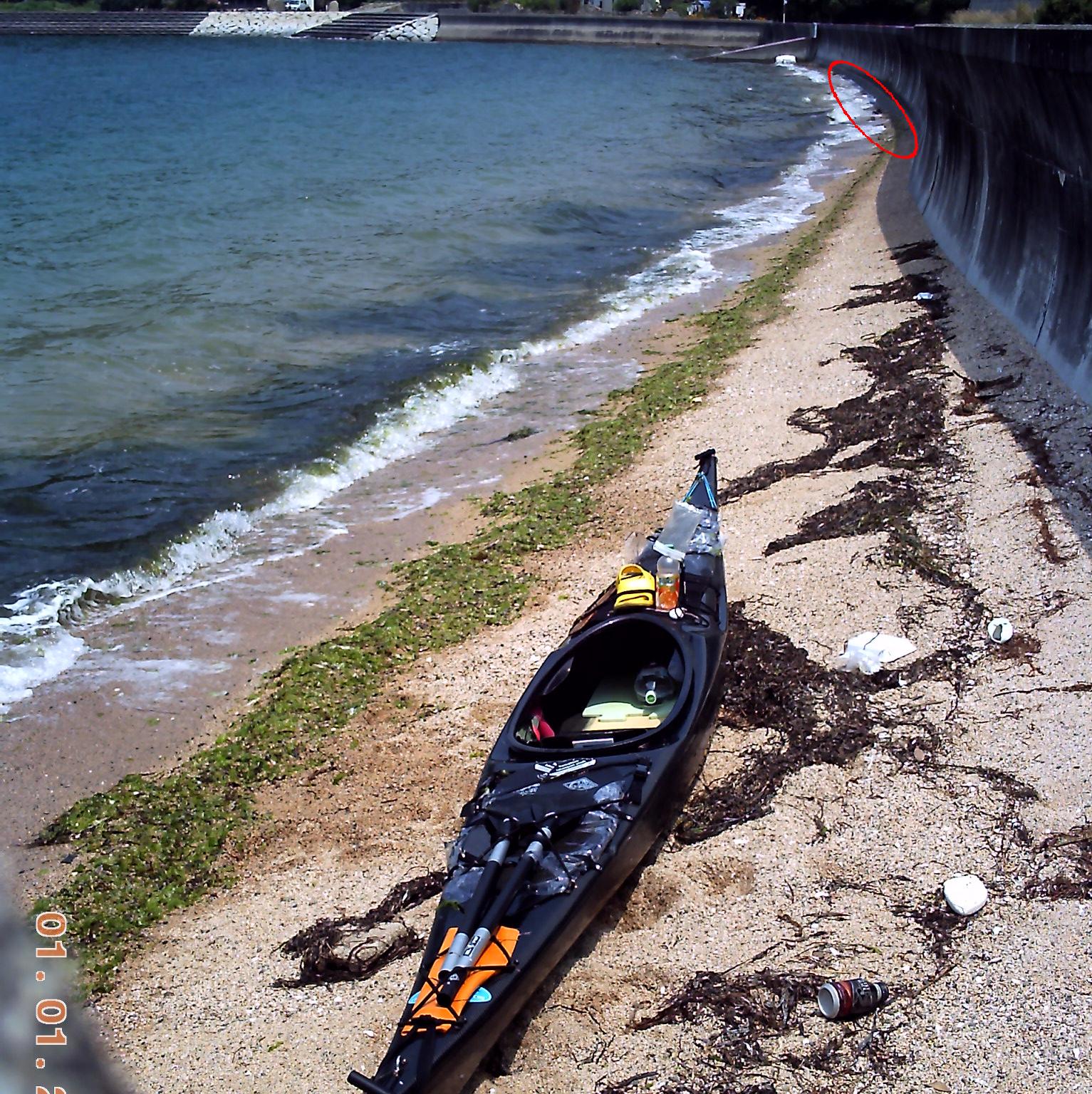下左の写真で艇を置いている場所が、右の写真の赤い丸の所です。