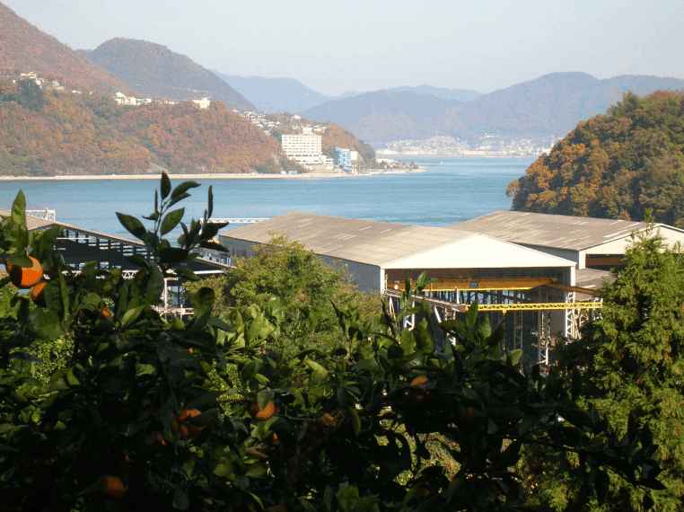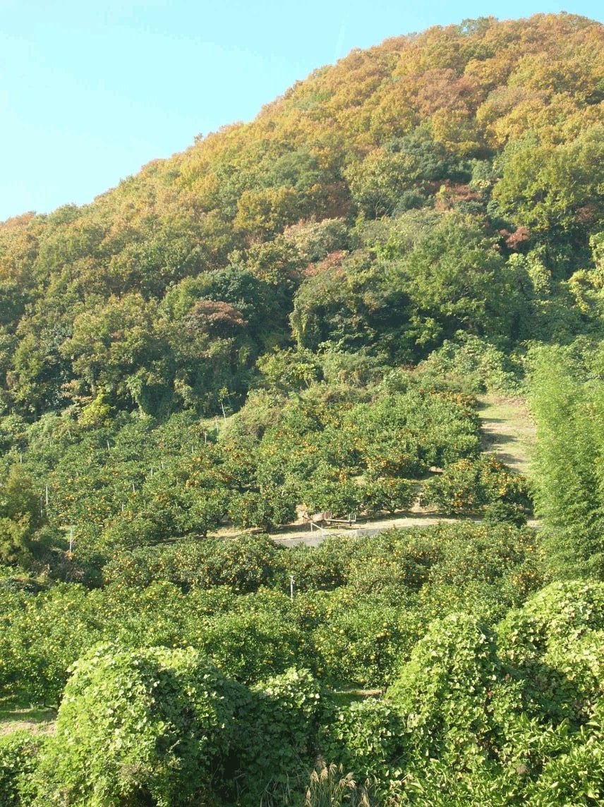 そして遠景の島、紅葉した雑木の山の麓に広がる蜜柑畑…