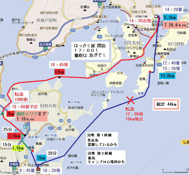 スタートで30分遅れた事で「鼻栗瀬戸の難所で逆潮に ぶつかるかも」と、