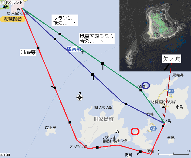 赤丸で囲った島が、本日のキャンプ地「矢ノ島」です。